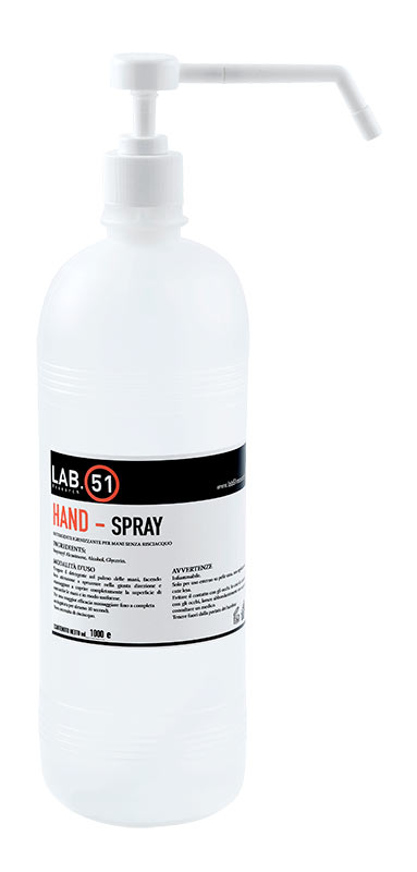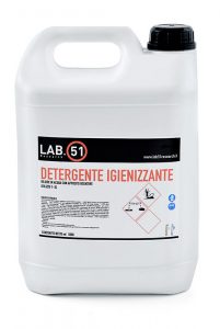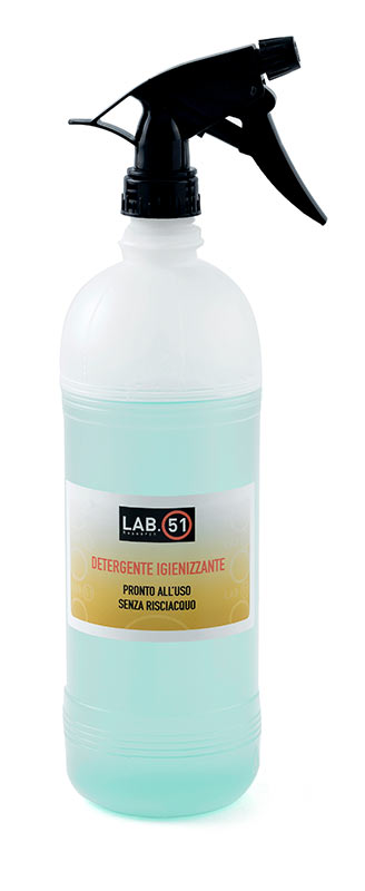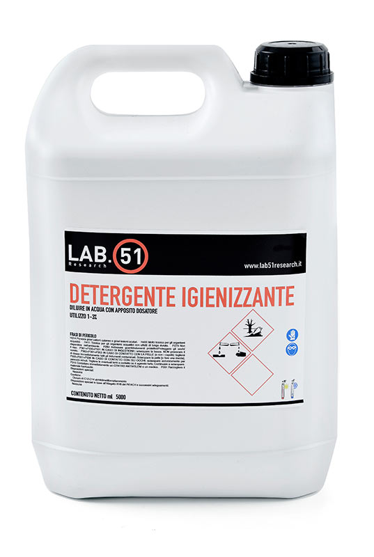 - Il detergente igienizzante è un formulato concentrato a base di sali di ammonio quaternario e tensioattivi con espresse caratteristiche detergenti. E’ un prodotto ideale per tutti gli ambienti che necessitano di sanificazione. Permette di ottenere in un unico ciclo elevati standard di igiene e pulito lasciando un gradevole profumo. Il prodotto in uso è estremamente efficace ed economico. Utilizzare l’apposito dosatore che permette di preparare il prodotto alla concentrazione del 2.5% in flaconi dotati di nebulizzatore dalla capacità di 1000ml. LAB51 offre ai suoi clienti un numero di flaconi con nebulizzatore pronti all’uso quotidiano. Una tanica di 5000 ml. è concentrata per 200 flaconi da 1000 ml.